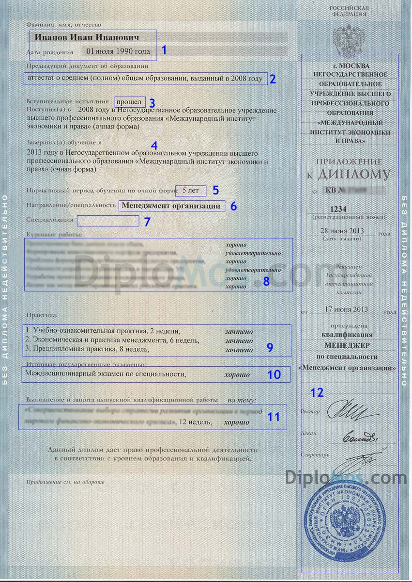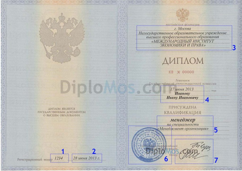№3 В верхней части правой стороны бланка диплома указывается город или населенный пункта (в примере: г. Москва), где находится вуз, и официальное название вуза в именительном падеже, согласно уставу данного высшего учебного заведения (в примере: Негосударственное образовательное учреждение высшего профессионального образования «Международный институт экономики и права» ).